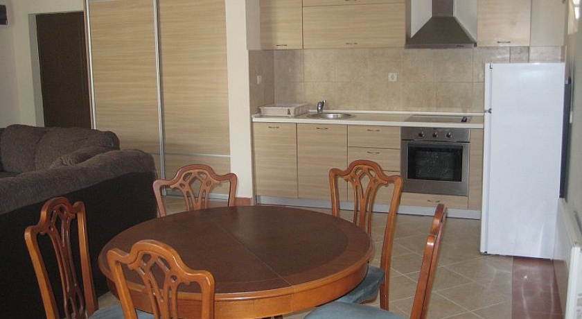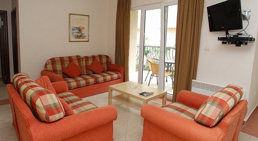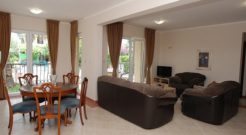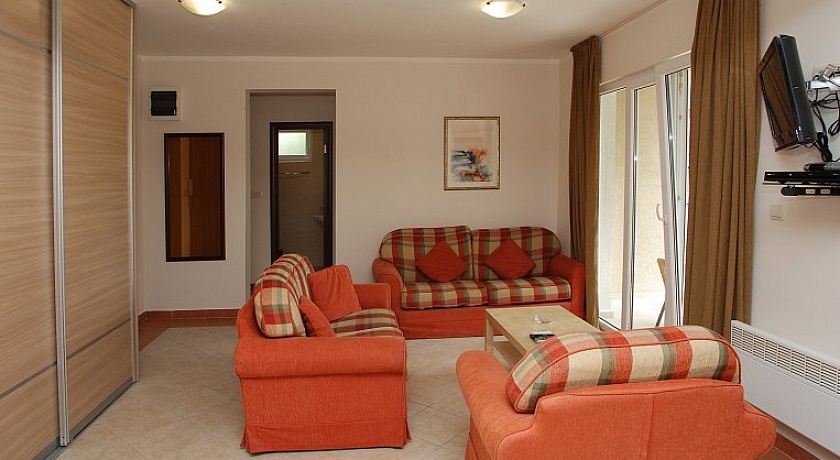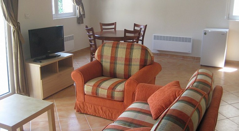 АРР 02+2 (№1,3,4,6): 50м2+ терраса 6м2 с видом на соседние дома, немного зелени вокруг терассы (за домом), гостиная с раскладным диваном, кухня, спальня с французской кроватью.